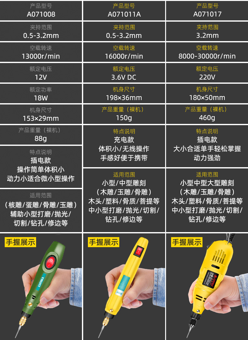 • 功能用途:打磨、抛光、雕刻、切割、钻孔