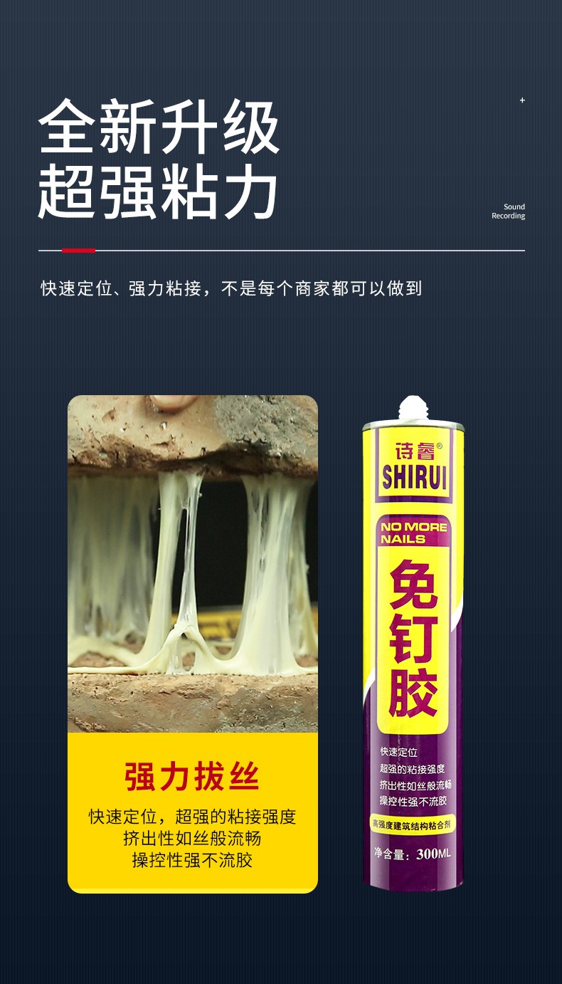商品名称:诗睿 免钉胶 玻璃胶 多用途强力液体钉 强力胶 高强度液体胶 环保型高效快干胶 室内外通用密封胶 白色(环保快干型) 300ml