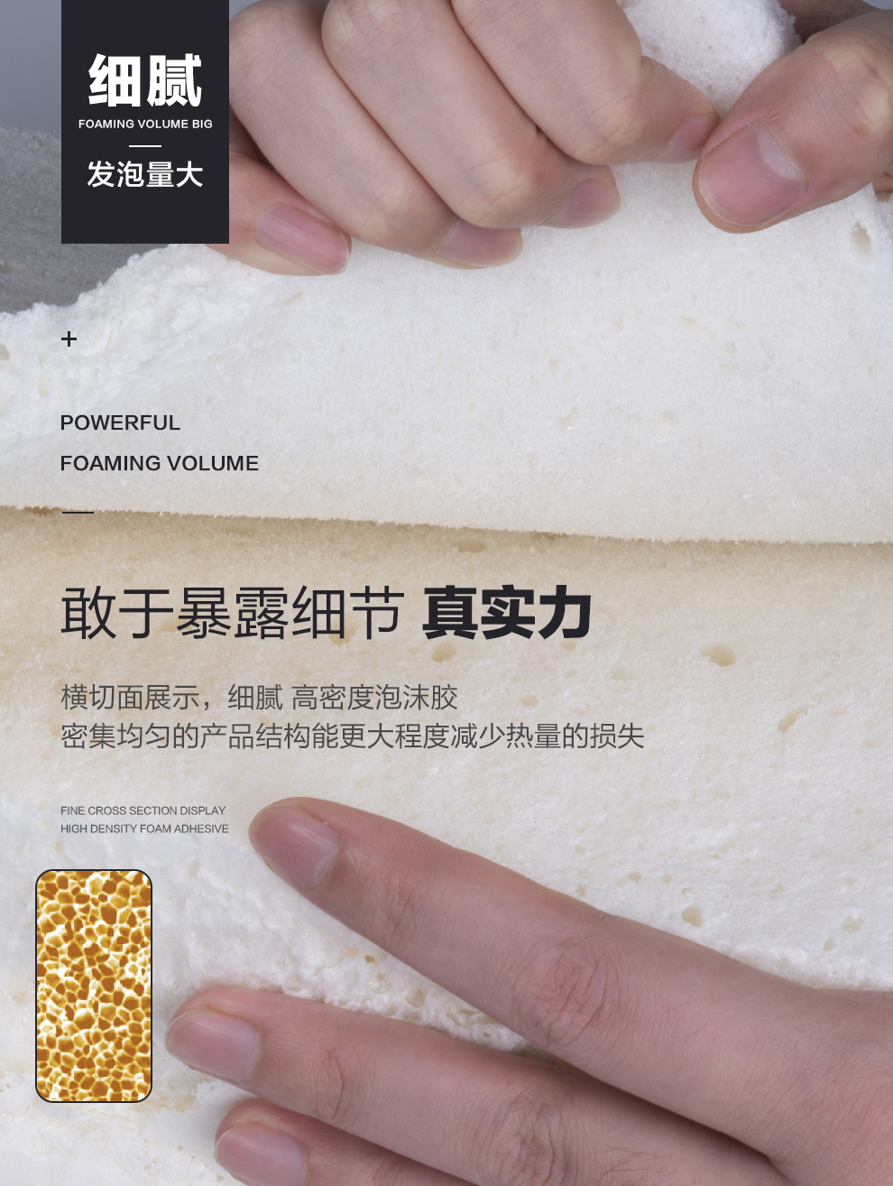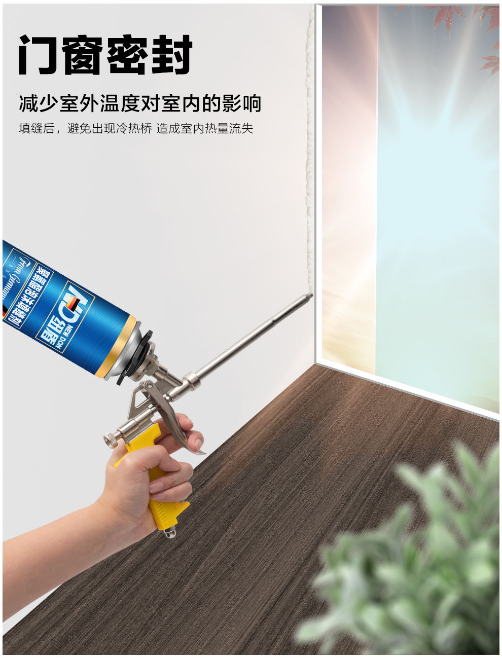 • 适用范围:门窗安装墙体填缝、浴缸地板,厨房孔洞封堵,隔热隔音降噪等