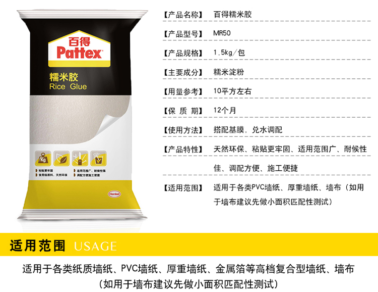 商品名称:汉高百得(Pattex)MR50 糯米胶 壁纸胶水 基膜墙纸胶水辅料 耐候性强 适用范围广 天然环保型 1.5kg