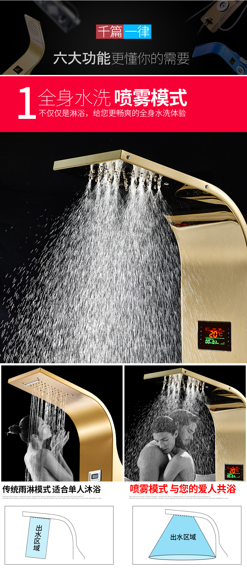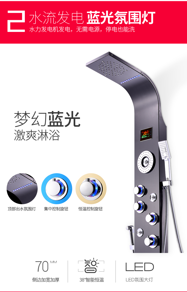 商品名称:SUS304不锈钢恒温淋浴屏柱花洒套装按摩淋浴一体式淋浴屏 S7-L宝石蓝