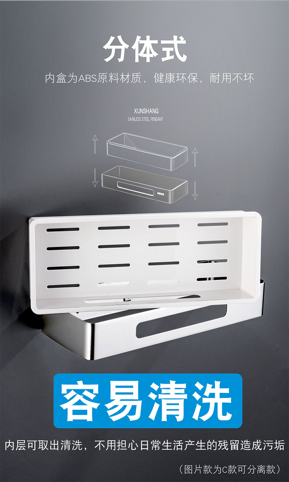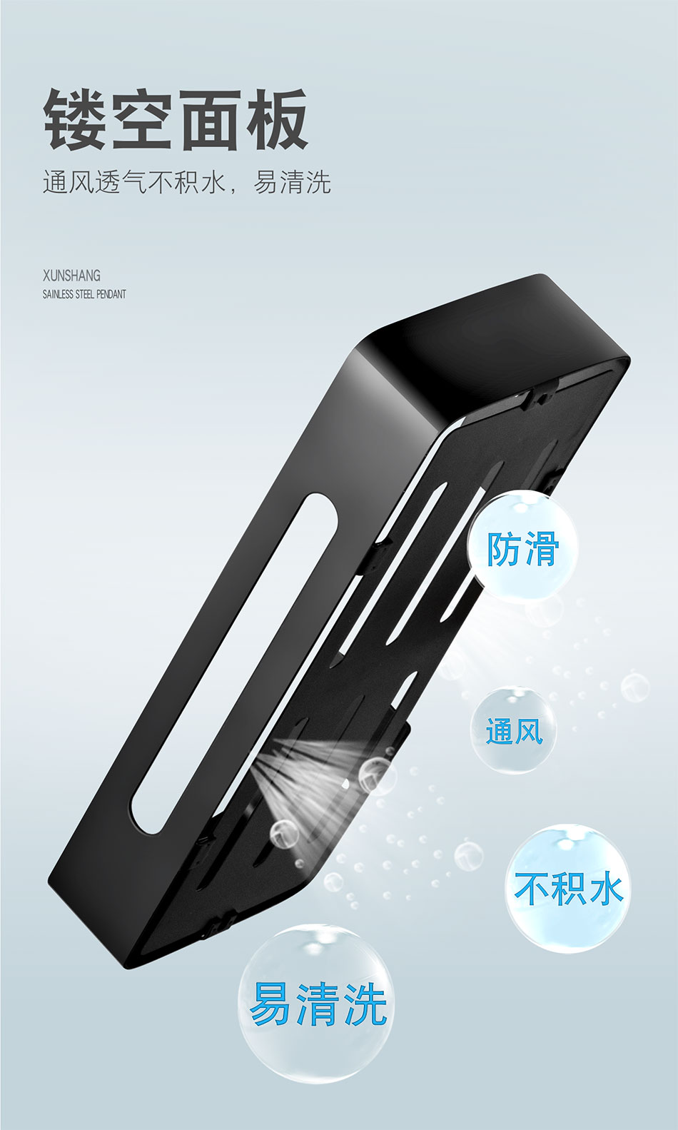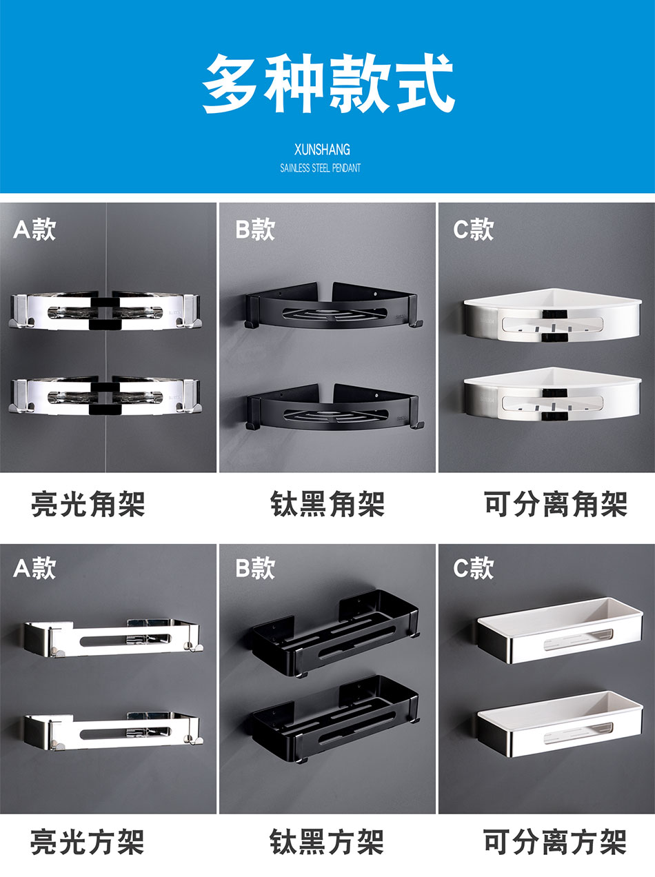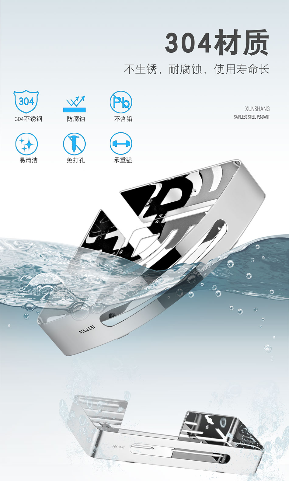 商品名称:迅尚 置物架卫生间浴室三角架不锈钢304厕所淋浴房洗手间厨房洗漱台收纳架挂件 免打孔 特厚方架单层带钩