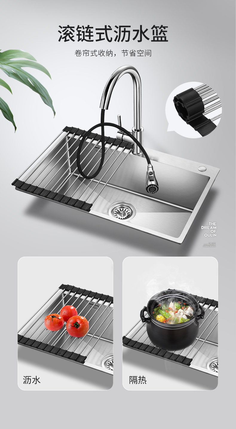 欧琳(OULIN)手工水槽单槽洗菜盆304不锈钢加厚厨房洗碗池套装洗菜池台上盆WGR9104 配CFL002精铜双出水抽拉龙头