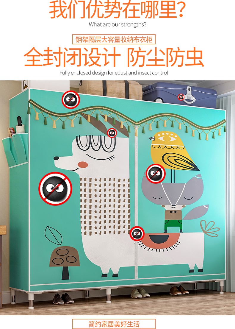 商品名称:小媳妇衣柜子 简易多功能卧室布衣柜钢管加厚加粗组装衣柜布大号双人钢架组装家具衣柜收纳衣橱 2533烟雨江南