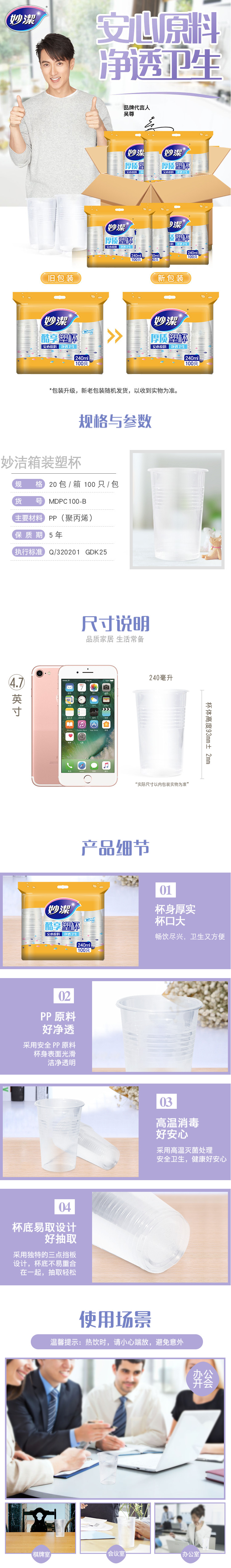 商品名称:妙洁 240ml 塑料杯一次性中号 240ml/只 100只/包 20包/箱 单箱