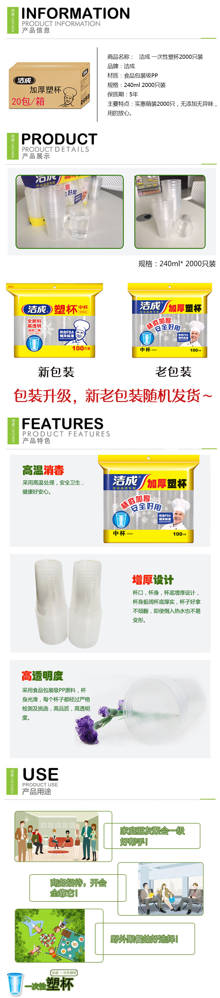 商品名称:洁成 一次性杯子 加厚塑杯 240ml/只 2000只/箱 单箱