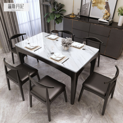 温斯丹尼 火烧石实木餐桌椅 北欧现代简约小户型大理石餐桌椅组合 6207 胡桃色+牛角椅(火烧石) 一桌四椅(无炉1.3米)